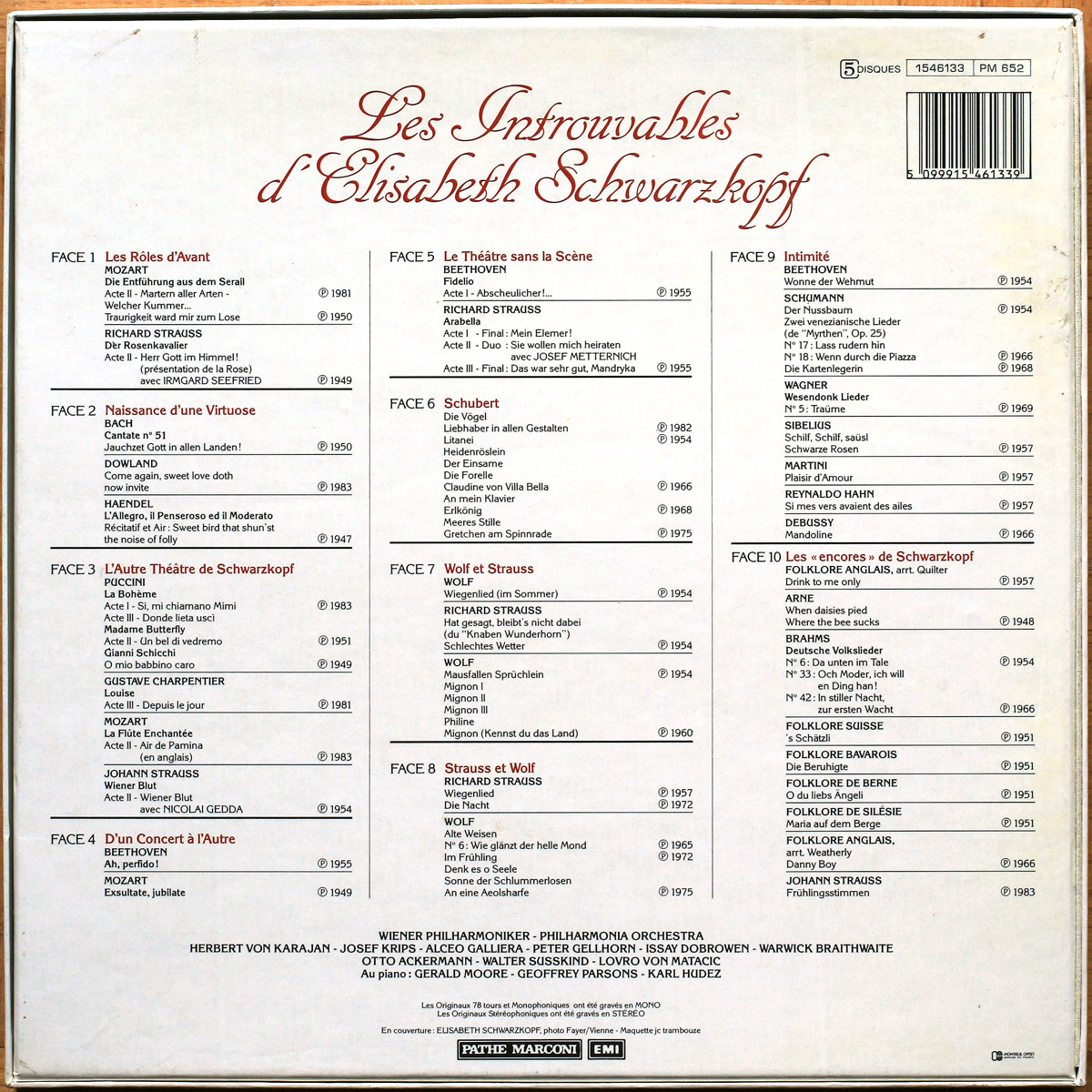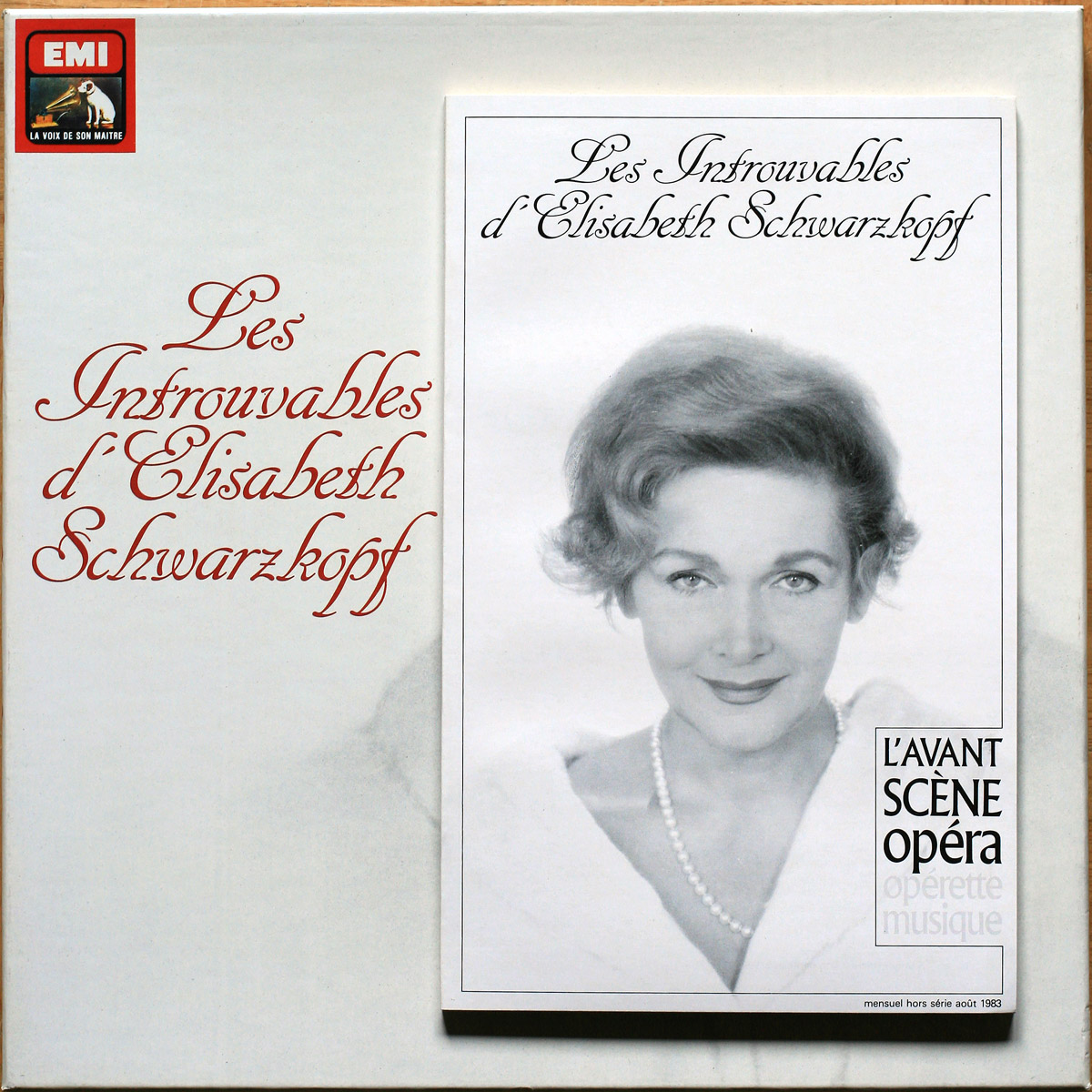 1. Le numéro spécial « Hors série » N ° HS2 d’août 1983 « L’Avant-Scène Opéra » de 148 pages intitulé « Les Introuvables d’Elisabeth Schwarzkopf ». C’est une édition spéciale de l’emblématique magazine d’opéra français, initialement édité pour accompagner et promouvoir ce coffret de 5 disques. À l’intérieur, se trouvent de nombreux articles sur Schwarzkopf, tous les compositeurs du disque, et les paroles (en allemand et en français)